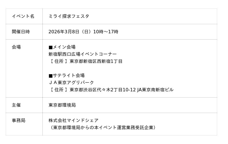 東京都環境局は、2026年3月8日(日)、小学生とその保護者を対象に、楽しみながら環境について学べる体験型イベント「ミライ探求フェスタ」を開催しました。会場となった新宿駅西口広場イベントコーナー及びJA東京アグリパークには、約4200名の小学生の親子の皆さんが来場し、工作やワークショップ、ステージプログラムなど多彩な体験を通じて環境について学ぶ1日となりました。