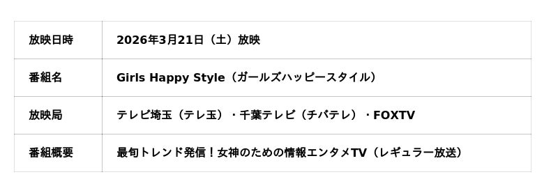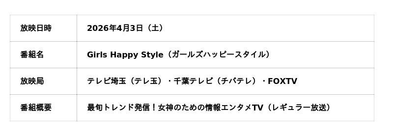 「Girls Happy Style」は、「最旬トレンド発信!女神のための情報エンタメTV」をコンセプトに、テレビ埼玉・千葉テレビ・FOXTVにてレギュラー放送されているエンタメ情報番組です。最新の美容・ファッション・ライフスタイルアイテムを毎週紹介しており、視聴者の支持を集めています。