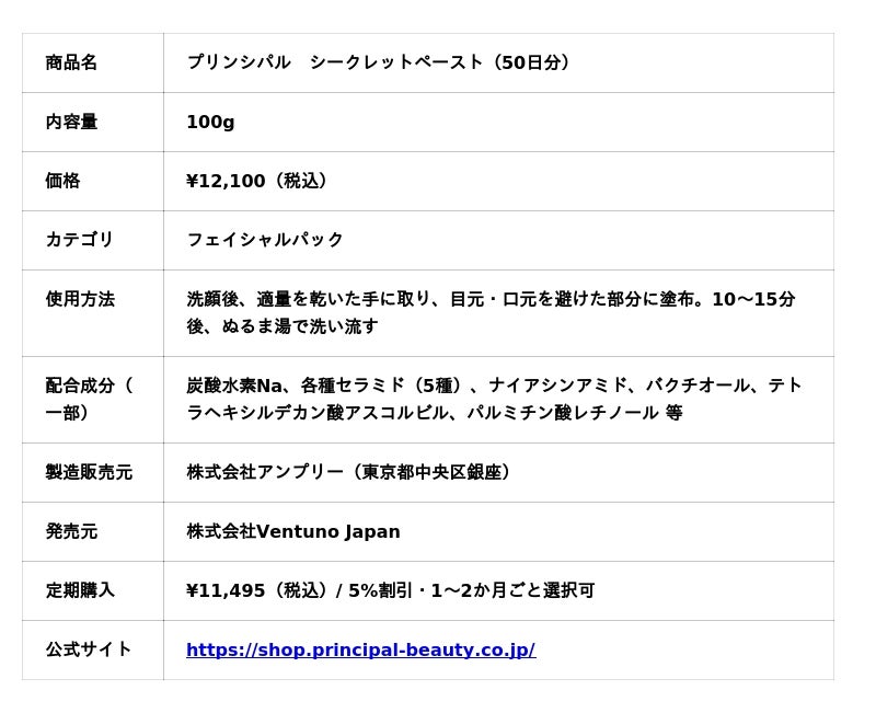 「プリンシパル シークレットペースト」は、肌が本来もつ水分を活用して炭酸ガスを角層で発生させる独自設計の高濃度炭酸パックです。サロン発想の集中スキンケアをご自宅で手軽に体験できるフェイシャルパックとして開発されました。