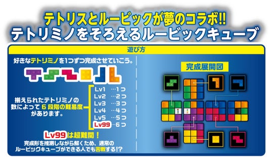 本商品は「テトリス」に登場する、「テトリミノ」(正方形を4個つなげて作られた様々な形のブロック)をモチーフにした、立体パズルです。6種の「テトリミノ」を、ルービックキューブを回転させながら、指定の位置に正しく配置していきます。通常のルービックキューブのように「色をそろえる」だけでなく、「どのテトリミノを、どこに、どの向きで配置するか」という論理的思考力と空間認識力が同時に試される、新感覚のパズルとして楽しめます。ルービックキューブを揃えられたかたが次のステップとして挑戦するのにもおすすめです。