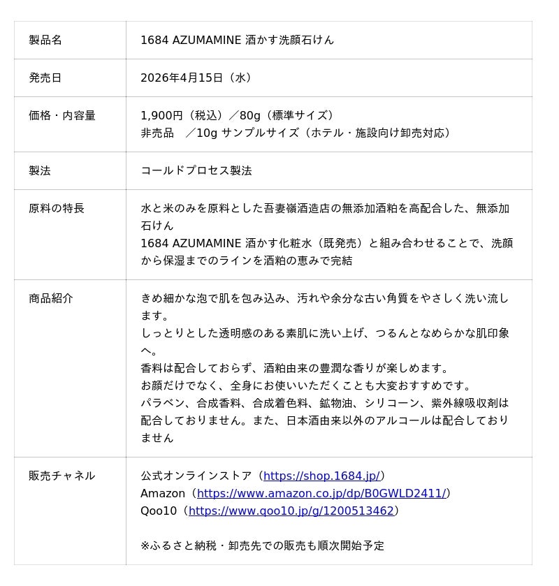「素のうつくしさ、肌をたしなむこころ、誠実なものづくり」を掲げる発酵スキンケアブランド「1684 AZUMAMINE」(株式会社1684/岩手県紫波郡紫波町、代表取締役:古川恵美)は、グッドデザイン賞2025を受賞した酒かす化粧水に続く第2弾プロダクト「酒かす洗顔石けん」を2026年4月15日(水)より発売します。
