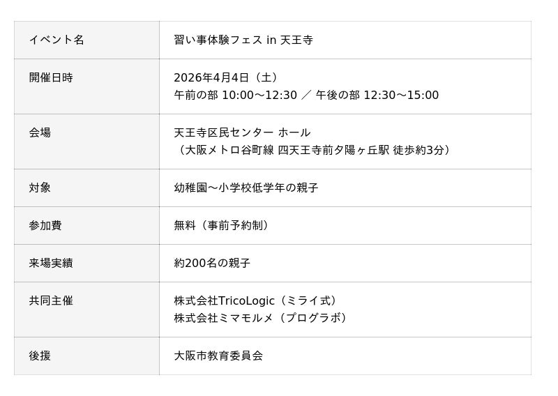 株式会社TricoLogic(本社:大阪市北区、代表取締役CEO:西尾彰将、以下「TricoLogic」)は、阪急阪神ホールディングスグループの株式会社ミマモルメ(本社:大阪市福島区、社長:藤井啓詳、以下「ミマモルメ」)が読売テレビ放送株式会社(本社:大阪市中央区、社長:松田陽三)と共同で構成するプログラボ教育事業運営委員会と共同で、2026年4月4日(土)に大阪市天王寺区民センターホールにて「習い事体験フェス in 天王寺」を開催し、約200名の親子にご来場いただきました。