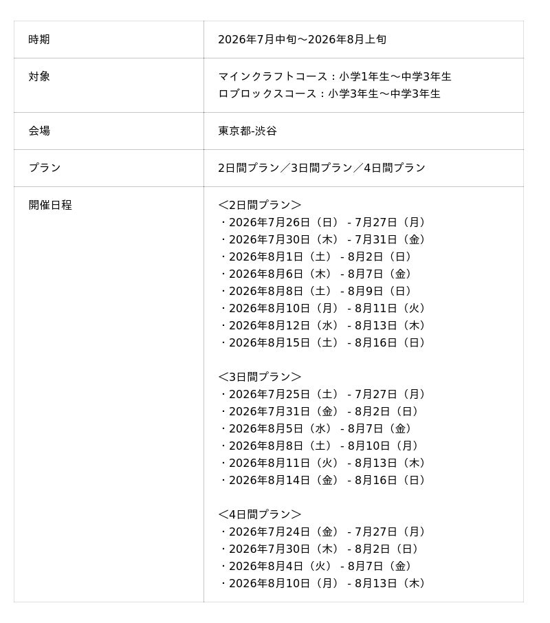 「Tech Kids CAMP Summer 2026」では、教育版マインクラフト「Minecraft Education」(※1)を使用するマインクラフトコースと、ゲーム開発環境「Roblox Studio」(※2)を活用するロブロックスコースの2コースを実施いたします。