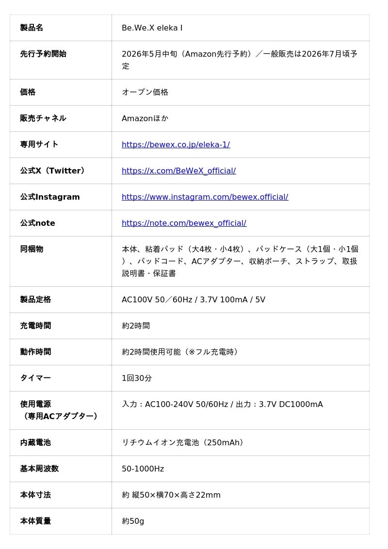 株式会社BHS(本社:静岡県藤枝市、代表取締役社長 大河原 吉貴)は、独自開発の「スイープ変調波」(特許第5423957号)技術を搭載した新リカバリーデバイス「Be.We.X eleka I(ビウェックス エレカ ワン)」を5月中旬より先行予約を受付開始することをお知らせいたします。これに先立ち、2026年4月17日、製品情報を公開し、専用サイトを公開いたしました。(https://bewex.co.jp/eleka-1/)