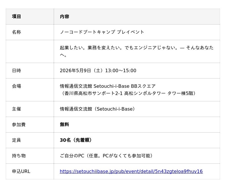 香川県においても、起業・副業を目指す方、個人事業主、経営者から、AIとノーコードを活用した事業創出への関心が高まっています。こうした地域ニーズを受け、情報通信交流館(Setouchi-i-Base)主催のもと、2026年6月より全5日間の「ノーコードブートキャンプ」を開講いたします。本講座に先立ち、最新AIエージェントツールの可能性を体感いただくプレイベントを開催し、ATH代表取締役の宮崎翼が講師として登壇します。