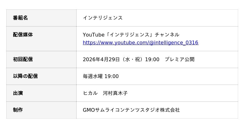 GMOサムライコンテンツスタジオ株式会社(代表取締役社長:橋口 誠 以下、GMOサムライコンテンツスタジオ)は、当社では初めてとなるYouTubeチャンネル、「インテリジェンス」を立ち上げました。このたび、同チャンネルにおいて、YouTuberヒカル氏と金融コラムニスト河村真木子氏が出演する新番組『インテリジェンス』の配信を開始します。初回配信は2026年4月29日(水・祝)19:00、以降毎週水曜19:00に配信します。