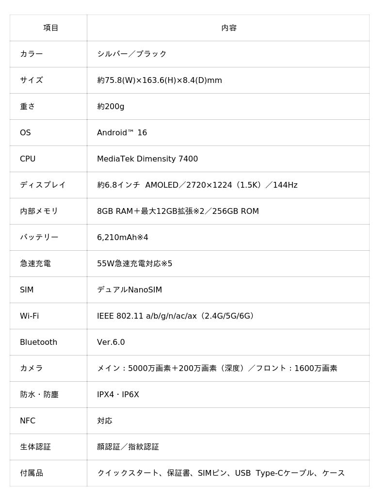 - MediaTek Dimensity 7400(4nm) + 最大20GB相当※2のメモリ拡張、256GBストレージ