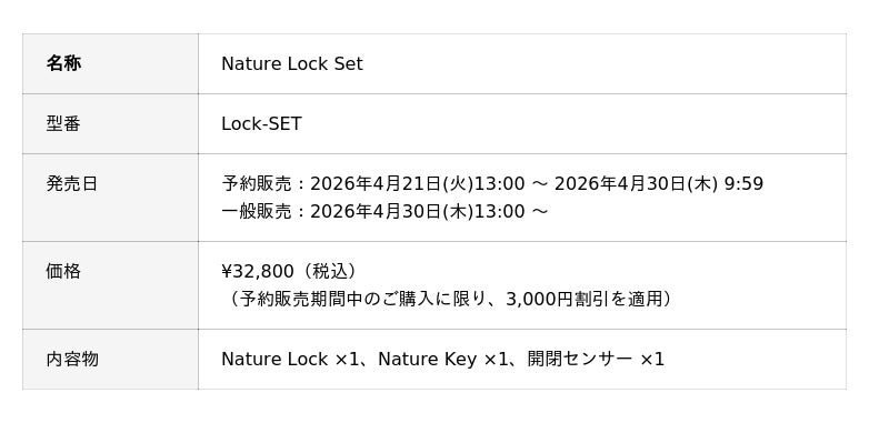 Nature公式サイト予約販売ページURL:https://shop.nature.global/pages/nature-lock