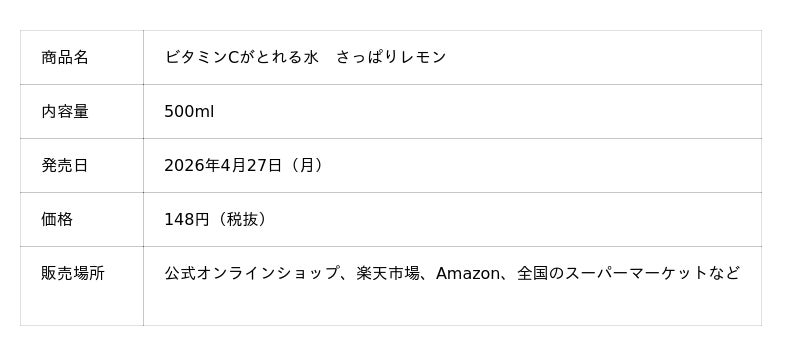 株式会社ドットミーが展開するCycle.me(サイクルミー)は、新商品「ビタミンCがとれる水」を4月27日(月)より発売します。本商品は、無糖・カロリーゼロ(*1)でありながら、1日分のビタミンCを手軽にとることができる水。(*2)すっきりとした飲み心地に、レモンピールをイメージした清涼感のある後味が特徴です。