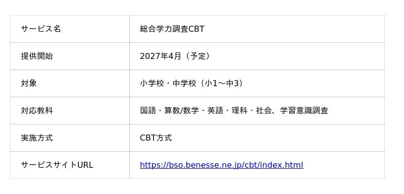 株式会社ベネッセコーポレーション(本社:岡山県岡山市、代表取締役社長:岩瀬大輔、以下:ベネッセ)は、小学校・中学校を対象に提供する「総合学力調査」を、CBT(Computer Based Testing)形式を導入した新サービス「総合学力調査CBT」へとリニューアルし、2027年4月より提供を開始します。