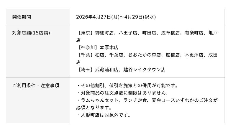 株式会社一家ホールディングスの連結子会社である株式会社一家ダイニングプロジェクト(本社:千葉県市川市、代表取締役社長:武長 太郎)が運営する、こだわりの羊肉を使ったジンギスカンと卓上のハイボールタワーを楽しめる店舗数日本一のジンギスカン専門チェーン※『大衆ジンギスカン酒場ラムちゃん』(以下、ラムちゃん)は、2026年4月27日(月)〜4月29日(祝水)までの3日間、「羊肉の日」イベントを開催します。本イベントは昨年アプリ会員様限定で開催し大変ご好評をいただき、今年はより多くのお客様にこだわりのジンギスカンを楽しんでいただくために、アプリ会員様以外のお客様も対象に開催いたします。期間中は、ラムちゃんの人気メニューである「塩〆熟成上ラム肩ロース」「漬込み熟成ジンギスカン」「飲めるジンギスカン」の3商品を、注文点数の制限なく何皿でも半額でご提供いたします。