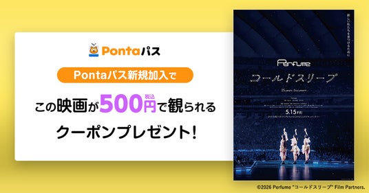 KDDIは2026年5月1日(金)から、約1,500万人が利用しているおトクなサブスクリプションサービス「Pontaパス」(月額548円)新規加入特典として、2026年5月15日(金)から公開される映画『Perfume“コールドスリープ”-25 years Document-』を500円(通常一律2,400円)で鑑賞できるクーポンを配布します。