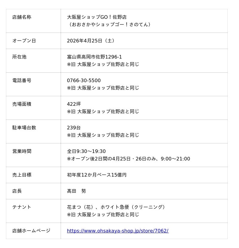 株式会社大阪屋ショップ(本社:富山県富山市、代表取締役社長:尾崎 弘明)は、4月25日(土)午前9時、富山県高岡市佐野地内に、地域の日常に寄り添うスーパーマーケット「大阪屋ショップGO!(ゴー!)佐野店」をオープンいたします。