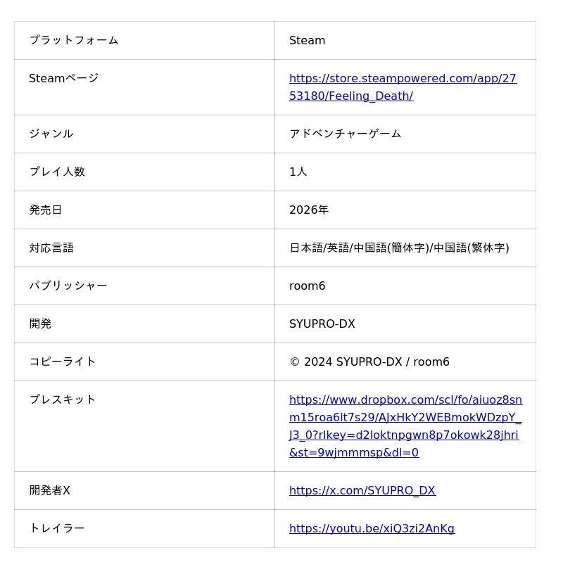 株式会社room6(本社:京都市左京区、代表取締役:木村征史、以下room6)は、2026年5月3日(日)に東京・浜松町で開催される東京ゲームダンジョン12に2026年内にSteamで配信予定のアドベンチャーゲーム『Feeling Death』を出展することをお知らせいたします。