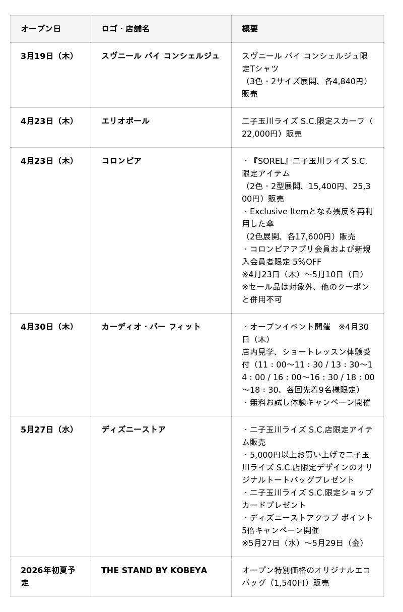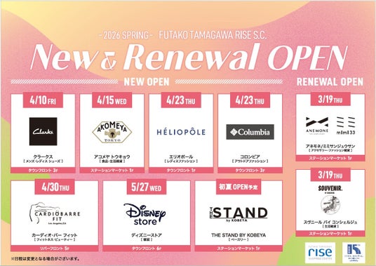 今年、開業15周年を迎えた二子玉川ライズ・ショッピングセンター(以下、「二子玉川ライズ S.C.」、東京都世田谷区、総支配人 大木さゆみ)では、2026年春、新店舗のオープンおよび既存店の店舗リニューアルを実施します。