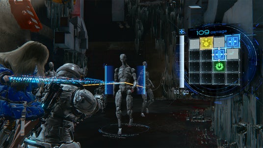 二人に襲い掛かる“ボット”たち。彼らにダメージを与えるには、ディアナの“ハッキング”で装甲を強制解除し、ヒューで銃撃を加えるのが有効だ。協力して窮地を突破せよ。