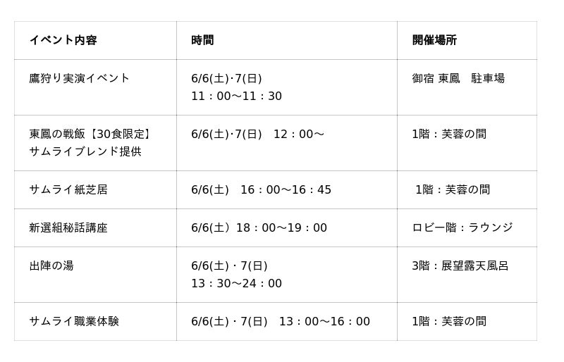 東山温泉は、新選組副長・土方歳三が湯治に訪れたとされる歴史を持ち、武家社会と深いつながりのある温泉地※です 。一般財団法人会津若松観光ビューローでは昨年秋に続き、6月6日(土)・7日(日)に「會津SAMURAI WEEK」を開催します。2025年に初めて開催された本イベントは、地域を盛り上げる精鋭たちによるイベントです。地域で50年以上ともに歩む東鳳もこの考えに賛同し、会津の歴史的背景を観光資源として再構成し、食事・体験・空間演出の3つの領域で一貫した武家文化の体験価値を提供する「湯守サムライ〜戦の前に東山の湯で整う〜」を開催。スタッフが甲冑の衣装を羽織り、来館者を迎えます。さらに、1日30食限定の「戦飯(いくさめし)」の販売、富久栄珈琲のPOPアップイベント「サムライブレンド」の提供、絵付け体験や会津木綿のものづくり体験、鷹匠による鷹狩りの実演、生薬を使用した変わり湯「出陣の湯」、會津新選組同好会局長による歴史講座、参加型の紙芝居など、多彩な企画を実施します。