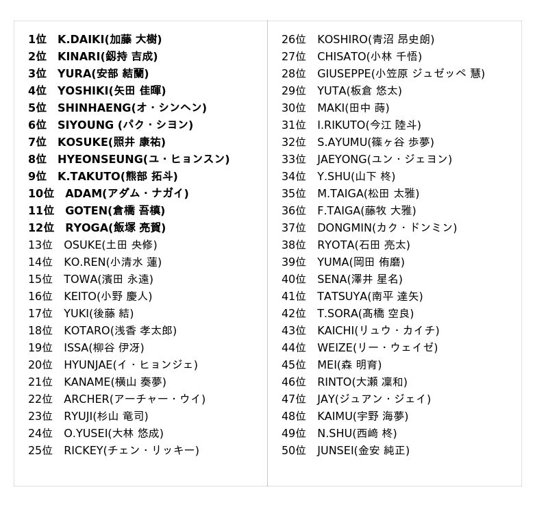 まず、12位にランクインしたのは、ダンスも歌も未経験だったRYOGA(飯塚 亮賀)。声を震わせながら「今の自分があるのはみんなのおかげだと思っています」と感謝を述べます。11位となったGOTEN(倉橋 吾槙)は、レベル分けテストの再評価でBからFに落ち、悔しい思いをした練習生です。今の順位に満足することなく、上を目指すと誓いました。101名のなかでもっとも多くの地域(43地域)から1位を獲得したのは、10位のADAM(アダム・ナガイ)。グループバトルは悔しい思いをしたとしつつ、国民&SEKAI プロデューサーや練習生から力をもらっていると語りました。K.TAKUTO(熊部 拓斗)は9位にランクイン。「僕の夢は、明日を生きる活力を与えられるアイドルになることですが、今の僕にはファンの方々の一つひとつの温かい声援が、明日を生きる活力になっています」と胸中を述べました。8 位になったのは、15位、10位と着実に順位を上げているHYEONSEUNG(ユ・ヒョンスン)です。自分の思いを述べたのち「僕の人生を半分やるから、君の人生も半分くれ。これは契約だ!」とアニメの名台詞を用いて挨拶を締めました。KOSUKE(照井 康祐)は7位にランクイン。アジア圏におけるSEKAI プロデューサーから大きく支持された彼は「常に皆さまからの期待を超えるパフォーマンスを見せて、デビューというかたちで恩返しができるよう精一杯頑張ります」とコメントしました。6位は、番組スタートからデビュー圏内にいるSIYOUNG (パク・シヨン)です。「日本語が上手じゃない」としながら「これからも毎日バチバチして、筋肉はバキバキにして上に上がります(順位を上げます)。ありがとうございます」と挨拶しました。5位に食い込んだのは、レベル分けテストで、心のこもったバラードを披露したSHINHAENG(オ・シンヘン)。母国・韓国の得票数で1位を獲得したSHINHAENGは「まだ夢の途中ですが、最後まで最善を尽くします」と誓いました。