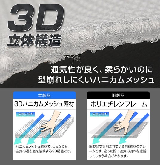 独自の立体構造を採用した3Dメッシュ素材により、座った状態でも空気の通り道をしっかり確保。旧来のPEフレーム製で課題だった「座ると風が遮断される」「お尻が痛くなる」といった不満を解消し、ソフトな座り心地と圧倒的な通気性を両立しました。
