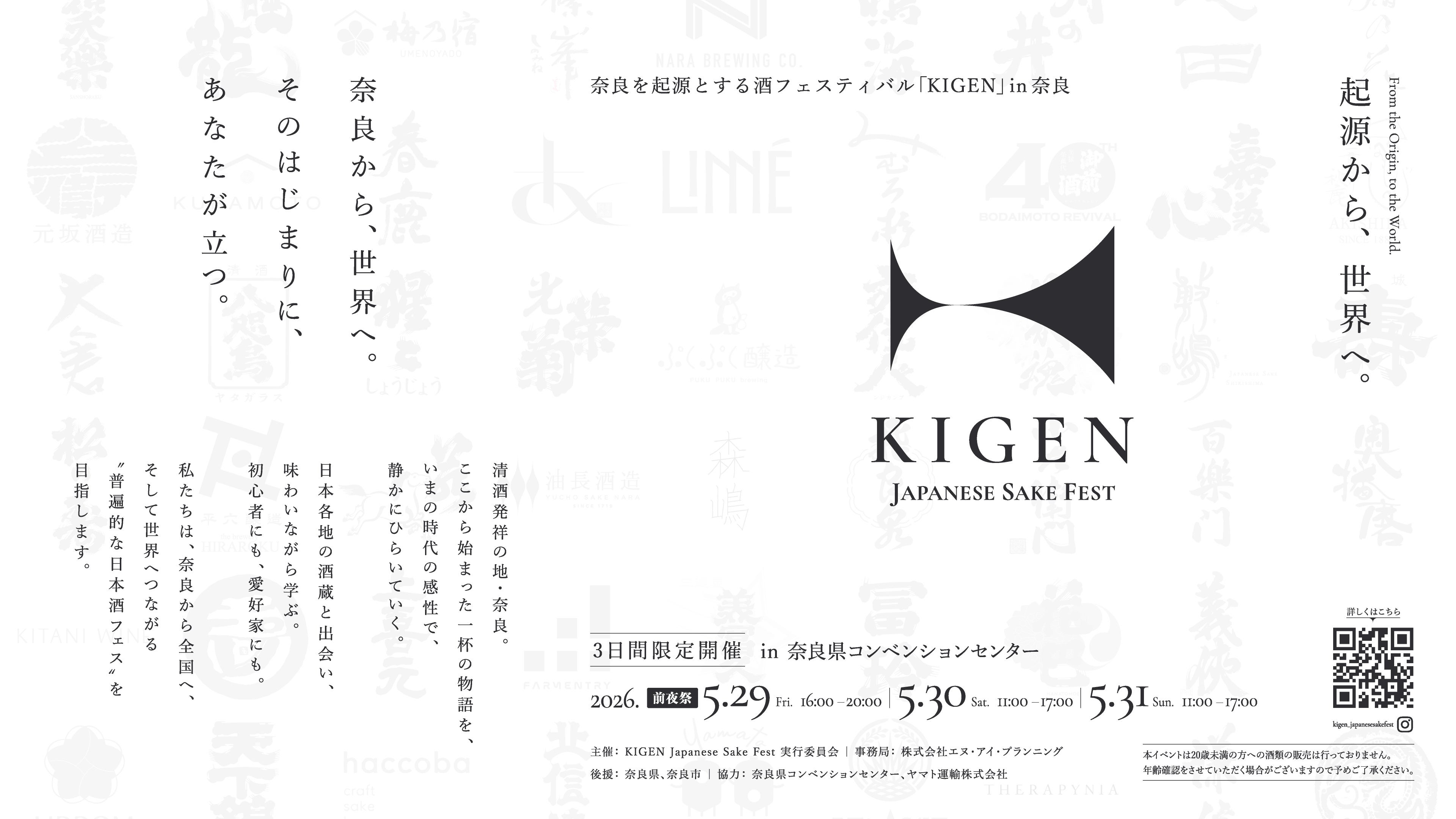 清酒発祥の地・奈良にて、全国の酒蔵が一堂に会する日本酒フェスティバル「KIGEN Japanese Sake Fest 2026」を、2026年5月29日(金)〜31日(日)の3日間、奈良県コンベンションセンターにて開催します。「起源から、世界へ。」をコンセプトに、日本酒の歴史・文化を体験型で伝える新しい日本酒の祭典です。奈良という歴史的背景を舞台とする“起源”から、日本全国の蔵元とともに、世界へと繋がる日本酒の魅力を発信します。