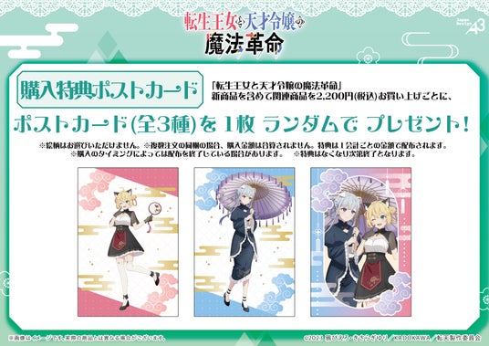 TVアニメ『転生王女と天才令嬢の魔法革命』の新作グッズを含む関連商品を、1会計で2,200円(税込)お買い上げごとに、ポストカード(全3種)をランダムで1枚プレゼントします。