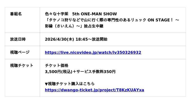 株式会社ドワンゴは、2026年4月30日(木)にLINE CUBE SHIBUYA(渋谷公会堂)にて開催される、色々な十字架 5th ONE MAN SHOW「タケノコ狩りなどで山に行く際の専門性のあるリュック ON STAGE! 〜彩縁(さいえん)〜」を、ニコニコ生放送にて独占生中継いたします。