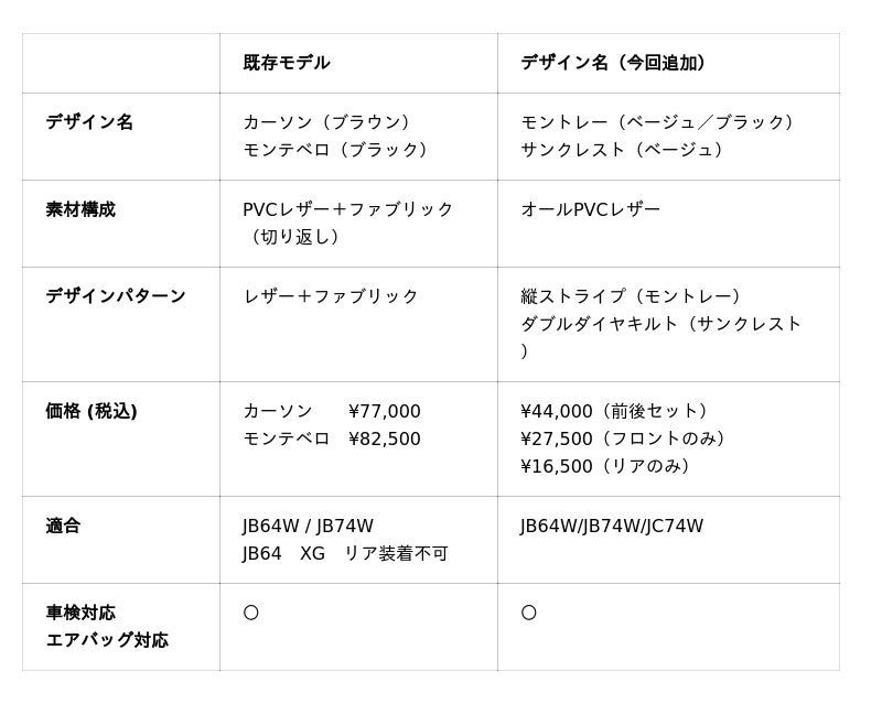 車種専用設計ならではのフィッティング精度、難燃性素材による車検対応、SRSサイドエアバッグへの安全配慮といった既存モデルの強みはそのままに、素材とデザインの選択肢をさらに広げるラインナップ拡充となります。