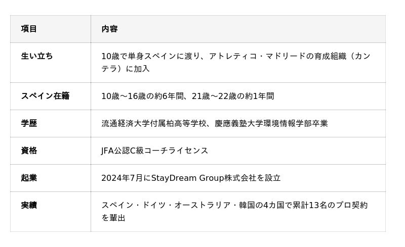 10歳で渡西しアトレティコ育成組織で6年間プレーした経験と、13名のプロ契約輩出実績を持つStayDream Group代表・宮川類が監修。都道府県別スクールランキング+育成コラム30本以上を無料公開
