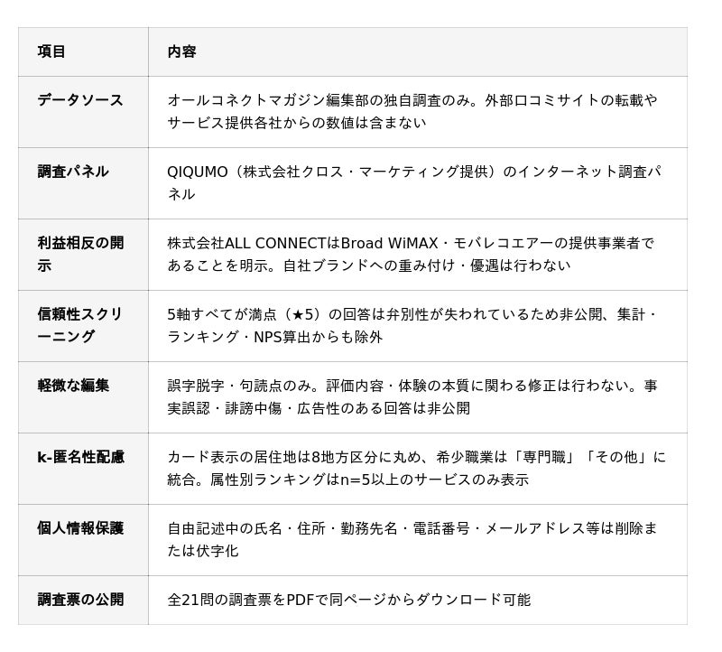 オールコネクトはBroad WiMAX・モバレコAirの提供事業者でもあります。通信サービスの販売にも携わる企業だからこそ、自社ブランドへの重み付けや優遇は一切行わず、全サービスを同一基準で評価し、読者・記者・研究者の誰もが検証できる状態にすることが信頼の前提だと考えています。利益相反の開示は本ページ「本調査について」セクションに明記しています。