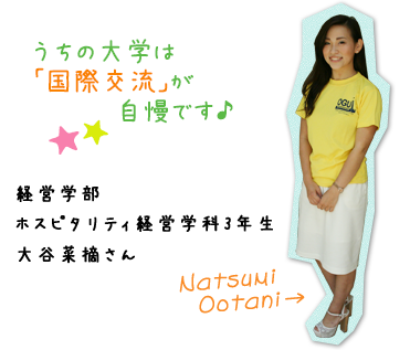 おもてなし満載のキャンパスをてくてく歩いていると、ロングヘアをなびかせる美女に遭遇。「うちの学校は国際交流が盛んで、いろいろな国から留学生が来ていたり、自信を持って留学するためにネイティブスピーカーから英語が学べるところが人気なんですよ」と同校の魅力を教えてくれました。せっかくなので、大谷さんにオープンキャンパスを案内してもらうことに!