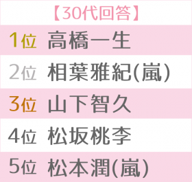 例年、ベスト10に半数程度を占拠するジャニーズタレントだが、今年も嵐の5人に加え、8位の【山下智久】の6人が入賞。常に女性を魅了する“絶対的な存在”として、改めてその強さが浮き彫りになった。さらに今年は、ドラマで大ブレイクを果たした高橋、竹内も堂々たる結果を残し、注目度の高さを証明した。やはり全体を通して、明るい笑顔と爽やかさがあり、知性や料理の腕前などの特技がある男性が人気という傾向に。男性は今回の結果を参考に、今後の“傾向と対策”にするのも良いかもしれない。