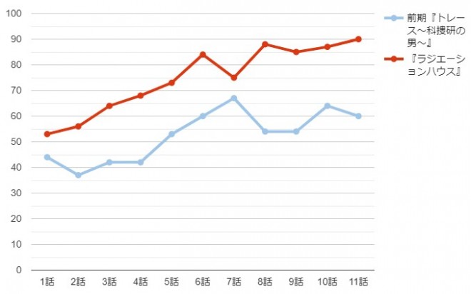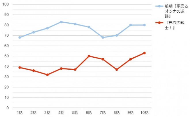 (1話)43 - 34 - 40 - 47 - 42 - 57 - 57 - 54 - 56 - 54 - 46(最終回)