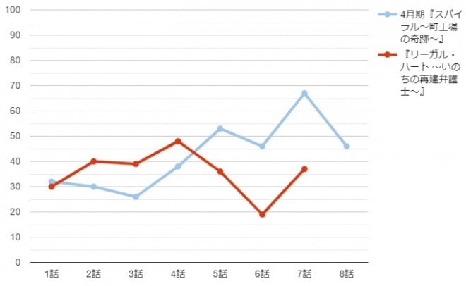 (1話)32 - 30 - 26 - 38 - 53 - 46 - 67 - 46(最終回)