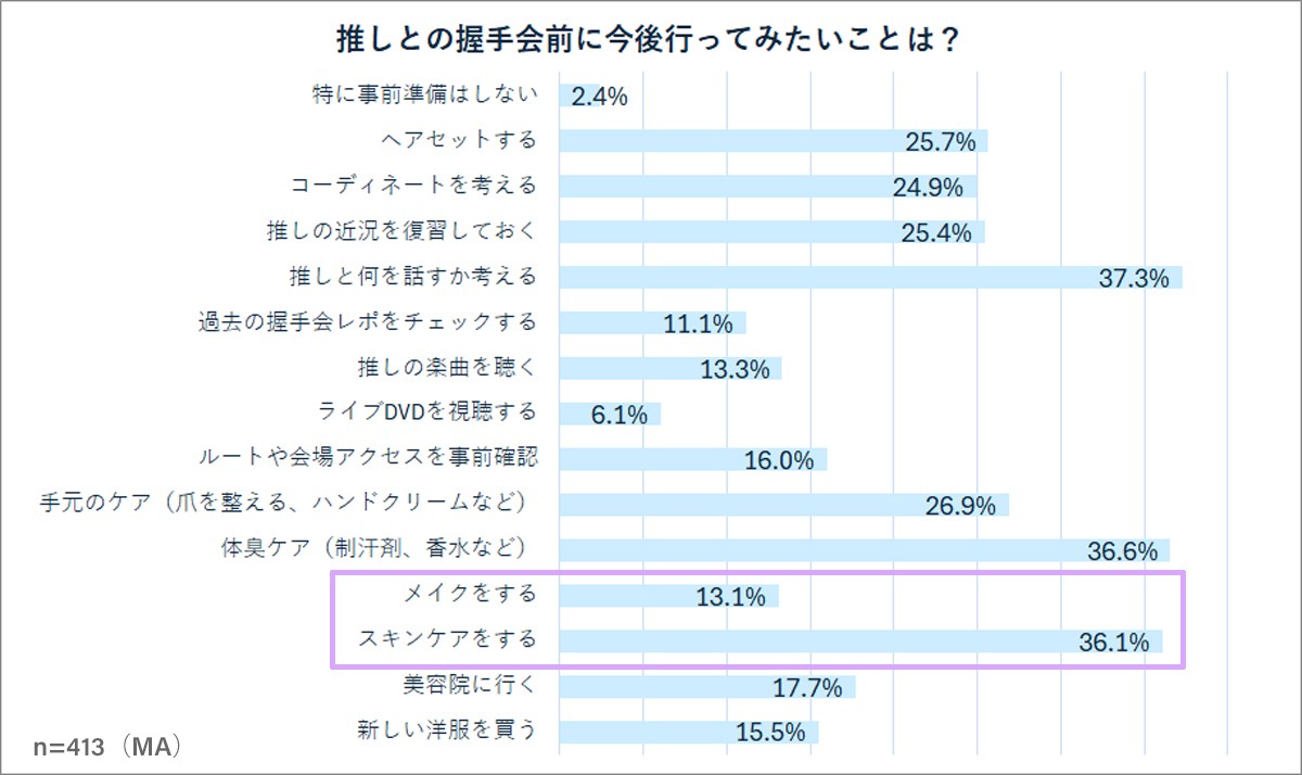 などの声が散見された。近年は、男性も美容意識の高まりから脱毛や肌ケアに気を使っている印象がある。しかし、見た目に気を遣う推し活男子でも、その方法に模索したり、スキンケアを毎日続けるのは面倒でサボりがちになったりする人も多いようだ。 また、「お金があれば…」(50代)とスキンケアや脱毛といった美容に対して、「時間とお金」をかけきれないジレンマを感じている人も少なくない。推し活において“第一優先は推し”であり、自分の見た目にかける「時間とお金」が、どうしても後回しになってしまうという推し活ならではの切実な悩みもあるようだ。推しという「大切な人と会うための準備」を、より「手軽に」「簡単に」したいと思うのもよくわかる。 気になる肌悩みも、推しに会う前にサッと塗って隠せるから安心