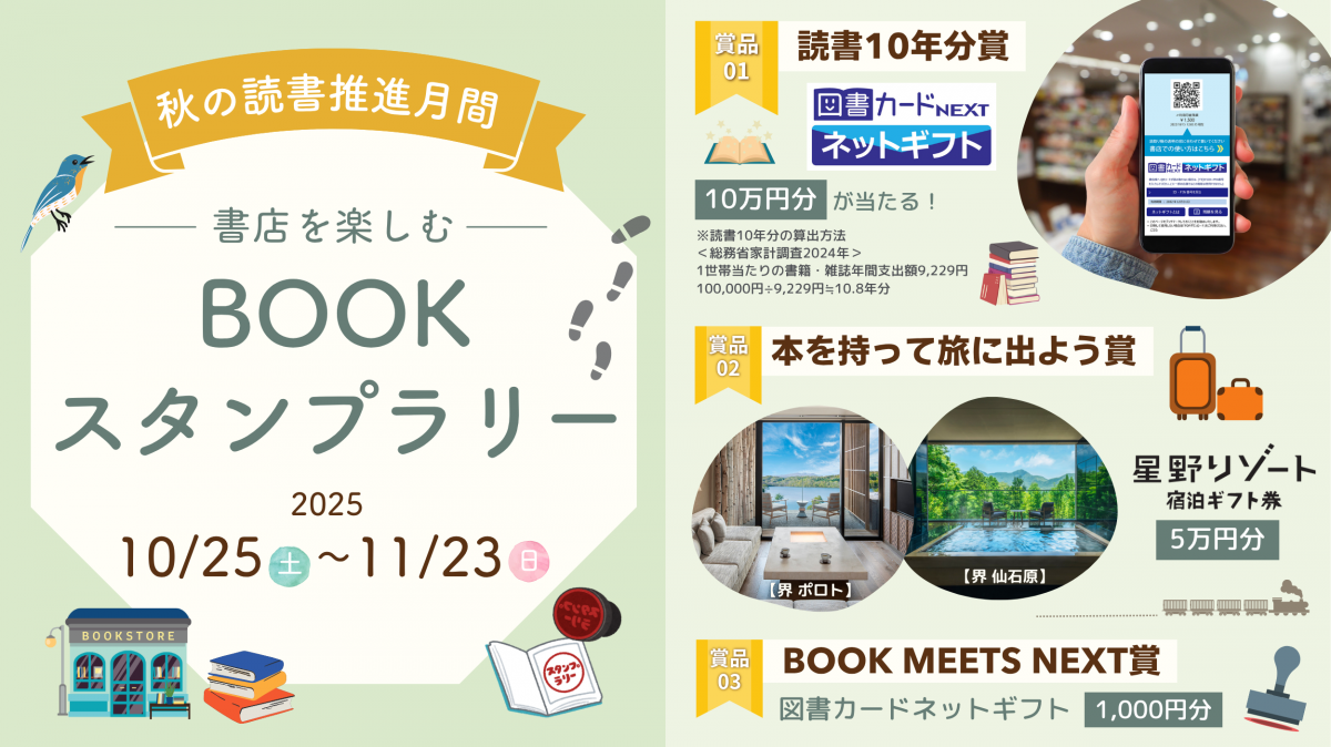 「BOOKスタンプラリー」が10月25日(土)〜11月23日(日)まで開催。全国約3,000の対象書店で掲載されているポスターのQRコードを読み取りスタンプをゲット。貯めたスタンプで豪華景品に応募ができる。