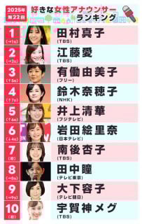 TOP10については、上垣アナを除く9人が35歳以上。10人の平均年齢は45.4歳となり、ベテラン、中堅、若手が交じり合い、TOP10の平均年齢が36.5歳となった「好きな女性アナウンサーランキング」とは大きく異なる結果となった。